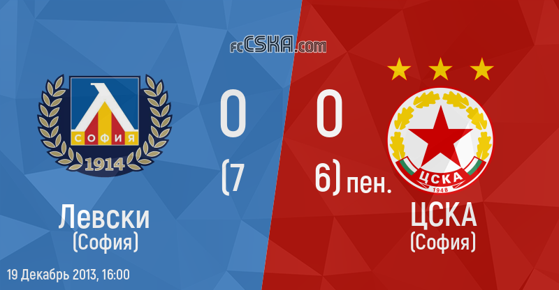 ЦСКА сыграла вничью с фк Левски (София) со счётом 0:0 в матче сыгранный 19 Декабрь 2013 г. в 16:00 ч. на стадионе „Васил Левски“ в София. за армейцев отличились Антон Карачанаков (130′ from penalty), Тодор Янчев (130′ from penalty), Апостол Попов (130′ from penalty), Ivaylo Chochev (130′ from penalty), Ventsislav Vasilev (130′ from penalty) и Dzhaksan Mendi (130′ from penalty).