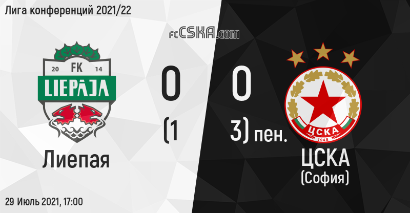 ЦСКА сыграла вничью с фк Лиепая со счётом 0:0 в матче Лига конференций 2021/22 сыгранный 29 Июль 2021 г. в 17:00 ч. на стадионе „Даугава“ в Лиепая. за армейцев отличились Грэм Кэри (129′ from penalty), Хорди Кайседо (129′ from penalty) и Жеферсон Телес (129′ from penalty).