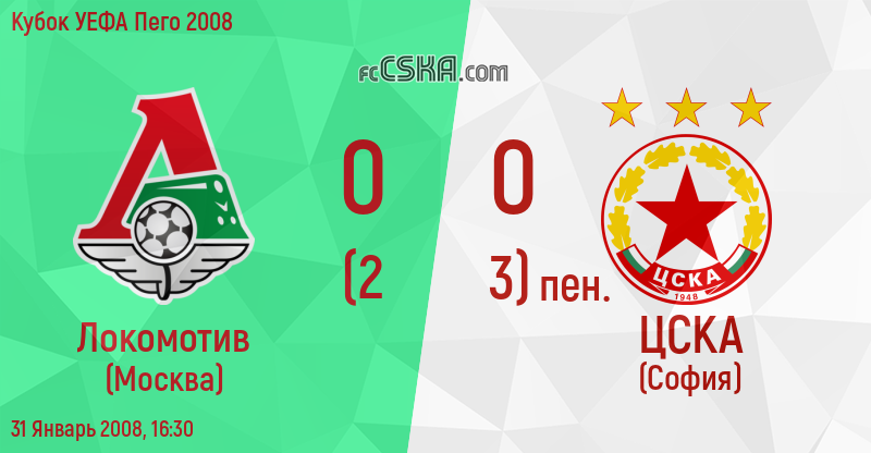 ЦСКА сыграла вничью с фк Локомотив (Москва) со счётом 0:0 в матче Кубок УЕФА Пего 2008 сыгранный 31 Январь 2008 г. в 16:30 ч. за армейцев отличились Markinyosh (92′ from penalty), Florentin Petre (92′ from penalty) и Hose Garses (92′ from penalty).