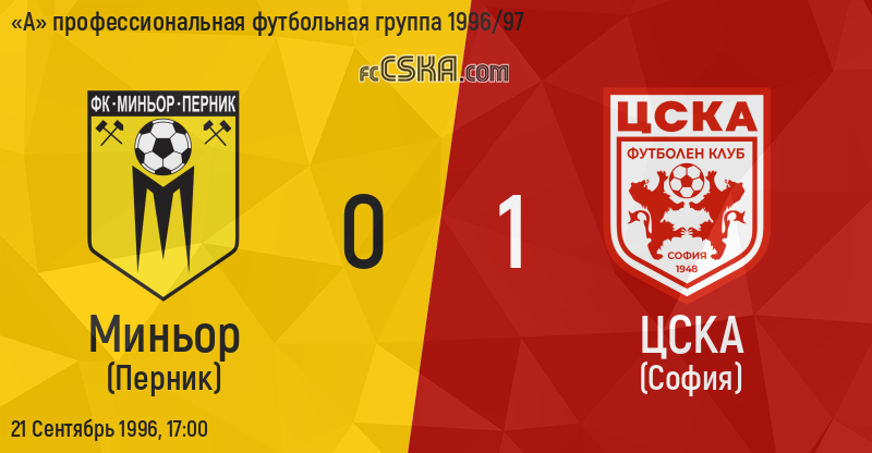 ЦСКА выиграл у Миньор (Перник) со счётом 0:1 в матче «А» профессиональная футбольная группа 1996/97 сыгранный 21 Сентябрь 1996 г. в 17:00 ч. на стадионе „Миньор“ в Перник. за армейцев отличился Димитр Иванов (83′).
