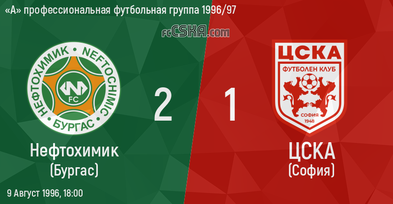 ЦСКА проиграла Нефтохимик (Бургас) со счётом 2:1 в матче «А» профессиональная футбольная группа 1996/97 сыгранный 9 Август 1996 г. в 18:00 ч. за армейцев отличился Ivaylo Andonov (41′).