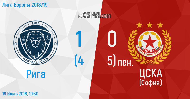 ЦСКА проиграла Рига со счётом 1:0 в матче Лига Европы 2018/19 сыгранный 19 Июль 2018 г. в 19:30 ч. за армейцев отличились Kristian Malinov (133′ from penalty), Nikolay Bodurov (133′ from penalty), Жеферсон Телес (133′ from penalty), Эдвин Гьяси (133′ from penalty) и Кирил Десподов (133′ from penalty).
