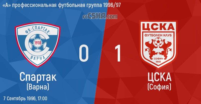 ЦСКА​ выиграл у Спартак (Варна) со счётом 0:1 в матче «А» профессиональная футбольная группа 1996/97 сыгранный 7 Сентябрь 1996 г. в 17:00 ч. за армейцев отличился Ivaylo Andonov (4′).