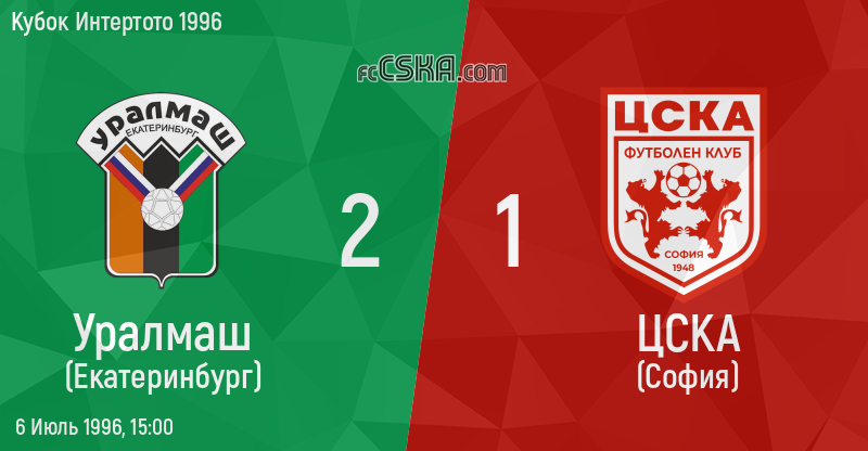 ЦСКА проиграла Уралмаш (Екатеринбург) со счётом 2:1 в матче Кубок Интертото 1996 сыгранный 6 Июль 1996 г. в 15:00 ч. за армейцев отличился Иво Славчев (20′).