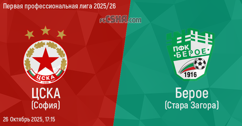 ЦСКА будет играть с Берое в матче Первая профессиональная лига 2025/26 26 Октябрь 2025 г. в 17:15 ч. на стадионе „Васил Левски“ в София. матч будет транслироваться в прямом эфире „Diema sport”.
