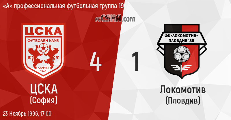 ЦСКА​ выиграл у Локомотив (Пловдив) со счётом 4:1 в матче «А» профессиональная футбольная группа 1996/97 сыгранный 23 Ноябрь 1996 г. в 17:00 ч. на стадионе „Болгарска армия“ в София. за армейцев отличились Петр Жабов (18′), Ivaylo Andonov (31′), Добромир Митов (66′) и Milen Petkov (87′).