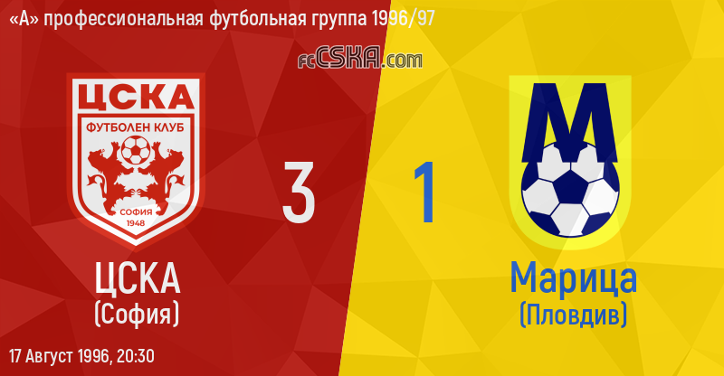 ЦСКА​ выиграл у Марица (Пловдив) со счётом 3:1 в матче «А» профессиональная футбольная группа 1996/97 сыгранный 17 Август 1996 г. в 20:30 ч. на стадионе „Болгарска армия“ в София. за армейцев отличились Ilia Voynov (28′ from penalty), Добромир Митов (56′) и Димитр Иванов (70′).