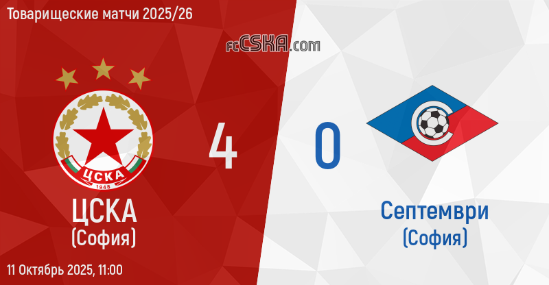 ЦСКА​ выиграл у Септември (София) со счётом 4:0 в матче Товарищеские матчи 2025/26 сыгранный 11 Октябрь 2025 г. в 11:00 ч. на стадионе „сп. компл. „ЦСКА““ в Панчарево. за армейцев отличились Леандро Годой (14′), Георги Чорбаджийски (27′) и Мохамед Брахими (45′). Автогол - guests scored Робин Шутен[1] (24′).