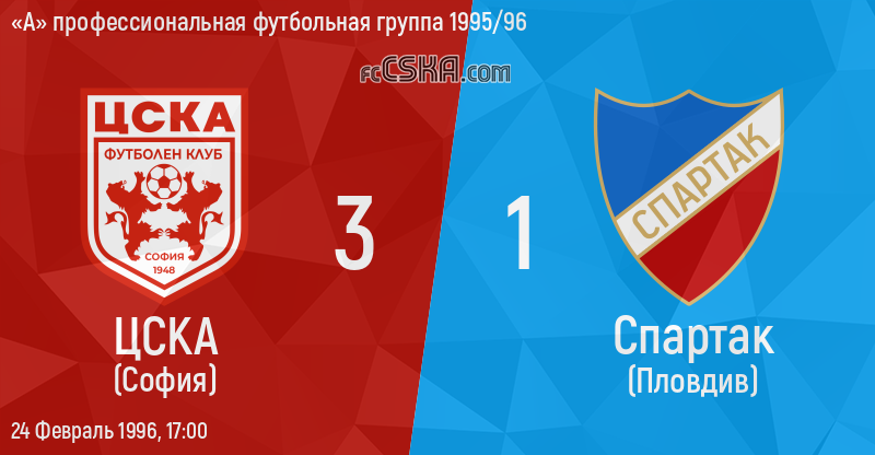 ЦСКА выиграл у Спартак (Пловдив) со счётом 3:1 в матче «А» профессиональная футбольная группа 1995/96 сыгранный 24 Февраль 1996 г. в 17:00 ч. за армейцев отличились Petar Mihtarski (47′ и 86′) и Georgi K. Georgiev (68′ from penalty).