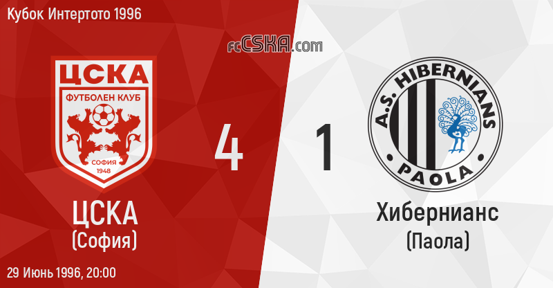 ЦСКА выиграл у Хибернианс (Паола) со счётом 4:1 в матче Кубок Интертото 1996 сыгранный 29 Июнь 1996 г. в 20:00 ч. на стадионе „Болгарска армия“ в София. за армейцев отличились Ilia Voynov (37′ from penalty), Методи Деянов (60′), Костадин Видолов (62′) и Петр Жабов (67′).