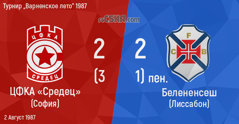ЦФКА «Средец» сыграла вничью с фк Белененсеш (Лиссабон) со счётом 2:2 в матче Турнир „Варненское лето“ 1987 сыгранный 2 Август 1987 г. за армейцев отличились Христо Стоичков (45′ from penalty) и Emil Kostadinov (48′).