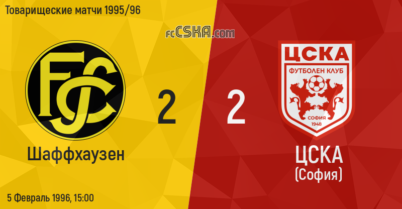 ЦСКА сыграла вничью с фк Шаффхаузен со счётом 2:2 в матче Товарищеские матчи 1995/96 сыгранный 5 Февраль 1996 г. в 15:00 ч. на стадионе „Агия Напа“ в Агия Напа. за армейцев отличились Христо Марашлиев (60′) и Румен Христов (65′).